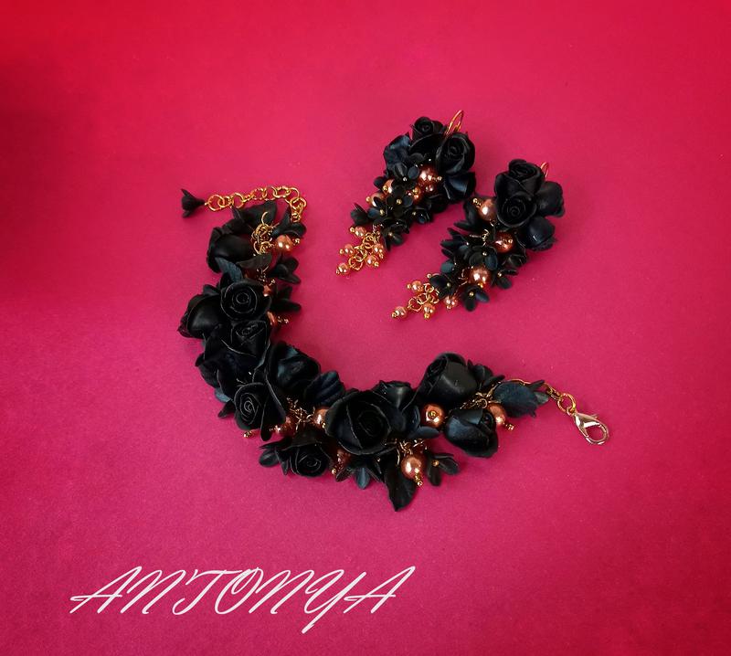Комплект браслет и серьги с миниатюрными цветами выполнен из запекаемой полимерной глины, цветы прочные и не боятся воды. Нарядный комплект украшений браслет и серьги с черными розами и золотистыми бусинами.. Использовалась фурнитура из бижутерного сплава, цвет фурнитуры под золото. Длина браслета 17 см плюс удлинительные колечки 3 см, длина серьги около 6,5 - 7 см. Оригинальный и стильный подарок любимой девушке, жене, подруге, сестре на день рождения, на годовщину свадьбы, на юбилей, на 8 марта. Необычный подарок, дизайнерское украшение, эксклюзивный подарок, авторское украшение.