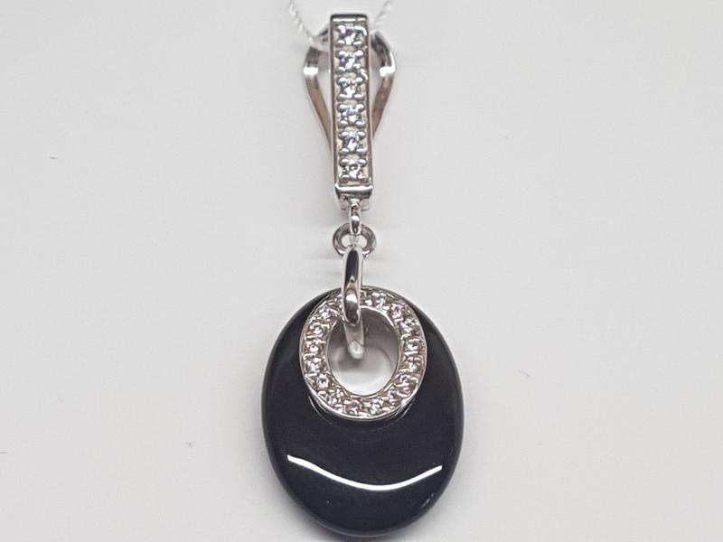 Підвіска з білого золота 585 проби з вставками фіанітів і агата. Агат – напівдорогоцінне мінерал, різнобічний і багатогранний, багаторівневий як світ і має таку різноманітність видів, зі своїми властивостями, що необізнана людина може просто заплутатися. Чорний агат вважається сильним оберегом, він володіє дивовижними властивостями. У природі зустрічаються різноманітні забарвлення каменя, що вражають уяву хитромудрими візерунками і грою кольорів, але чорний — енергетично найсильніший. В описі вказано середня вага виробу Вага конкретного виробу уточнюється при підтвердженні замовлення