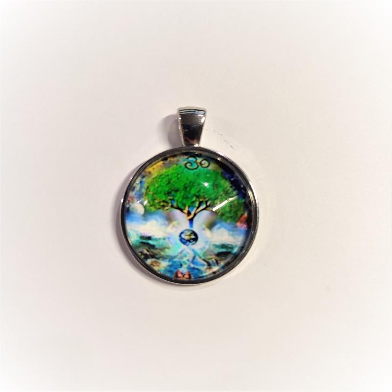 Кулон розміром 2,5 см у діаметрі. Скляний кабашон та цинковий сплав. До набору йде чорний шнурок.
