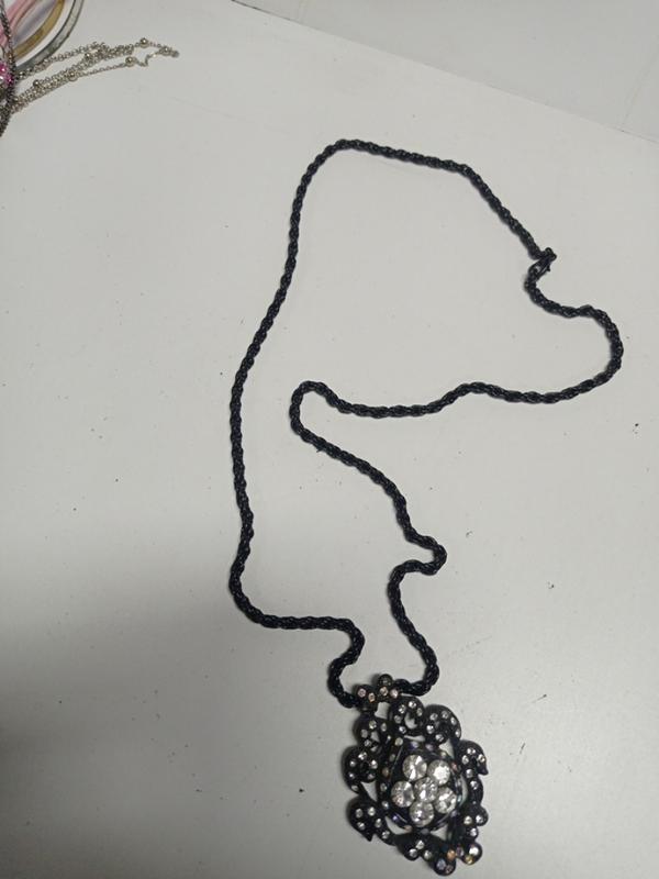 кулон на длинной черной цепочке..красивой формы..с камушками.