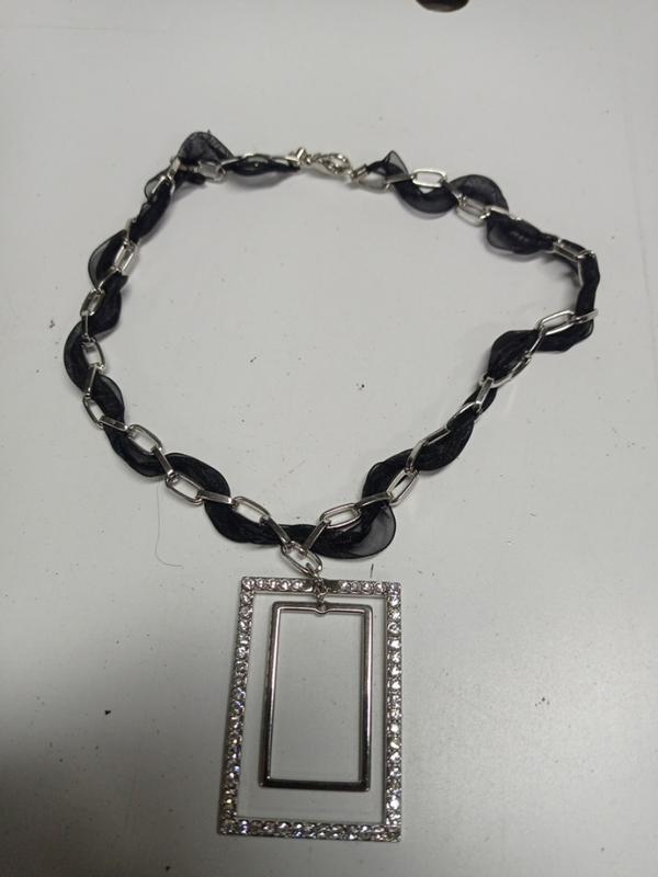 кулон на крупному ланцюгу переплетений тасьмою..прямокутник в камінцях та без.. рухається..цікавий.