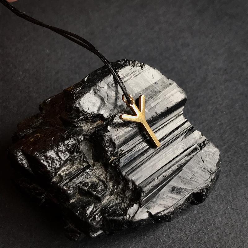 Підвіска, кулон, амулет зроблена зі сталі з позолотою, не боїться води, не викликає алергії. Розмір 16х11 мм Шнурок в комплекті, довжина регулюється рухливими вузлами Довжина ~ 60-65 см Альгіз (ᛉ) Альгиз - руна потужної захисту. Амулет з нею часто носять саме в якості оберега. Вважається, що руна Альгіз захистить свого власника від усіх неприємностей і негараздів, навіть якщо вони будуть відбуватися зовсім поруч. Альгіз допомагає знайти в собі сили для вирішення проблем і розвивати моральну стійкість і рішучість. Ця руна символізує високу духовність, набуття єдності з вищою свідомістю, творчість і удачу, яка активізується, коли людина починає чути і розуміти свій внутрішній голос. Альгіз не тільки відводить від людини все погане, але і зміцнює внутрішній дух, щоб ті речі, які раніше могли б похитнути внутрішній баланс, тепер не мали б жодної ваги. Значення: захист, заступництво вищих сил, зв'язок з вищою свідомістю, допомога