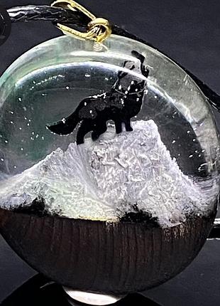 Кулон з дерева та епоксидної смоли «вовк на горі» + подарункова коробочка (3d друк)