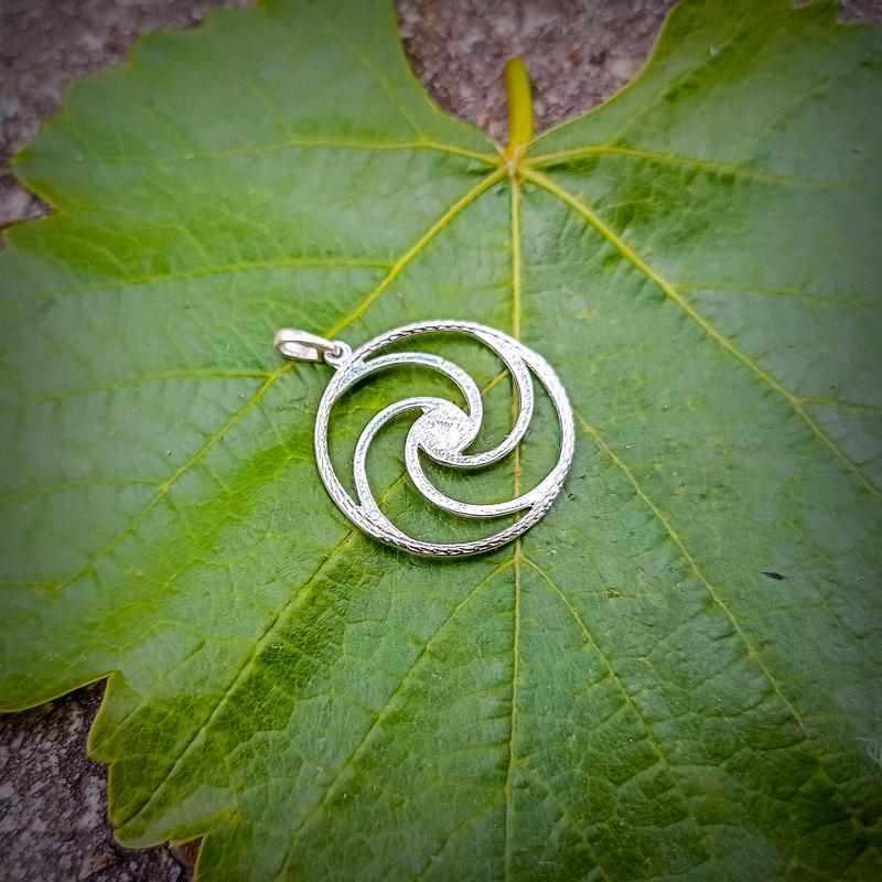 Кулон, підвіска спіраль. З найдавніших часів спіраль є символом життєвої сили: вона втілює у собі схематичний образ еволюції всесвіту і життя взагалі. Спіраль часто зображується у вигляді скрученої змії: «З бездонної глибини виникло коло у вигляді спіралі... Всередині спіралі, згорнувшись, лежала змія, символ мудрості і вічності». Спіраль пов’язана із символікою центру, початком усього, звідки починається розвиток, еволюція, рух життя. В цьому центрі концентруються сили, міць та енергія, що забезпечують життя. Це потужна творча сила, сонячна сила творіння, прихований вогонь. Окрім вогню, жару-тапасу, спіраль пов’язана і з водою, Великою Матір’ю, котра керує життям і смертю, грецьким Посейдоном. Спіраль як плавна нескінченна лінія символізує розвиток, безперервність, доцентровий і відцентровий рух, ритм дихання і самого життя. Особливе значення має подвійна спіраль, символізуючи відношення між протилежностями. З космічної точки зору, подвійна спіраль може розглядатися як проекція двох половинок Світового Яйця. Спіраль є магічним символом, що відображає подорож до центру, де будуть здобуті просвітлення, мудрість та інтуїція. Срібло, лиття, діаметр 25 мм, вага близько 2,2 г