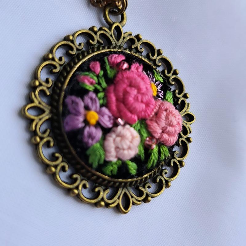 Кулон ручної роботи з квітковою вишивкою, оксамитова основа тканини, фурнітура нержавіюча сталь.