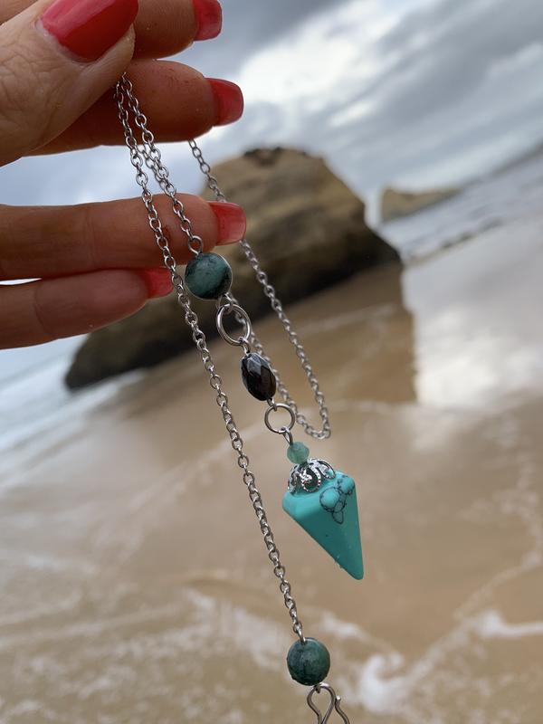 Маятник із натурального говліту, яшми, гематиту на фурнітурі з ювелірної нержавіючої сталі. Застібка – гачок. Для налагодження контакту фахівці рекомендують тримати маятник біля себе якомога більше, особливо на початку. Пропонований у нас маятник унікальний тим, що його можна носити на шиї як ефектний кулон. Таким чином він служить аксесуаром та взаємодіє з вашою енергетикою і завжди під рукою для роботи. Застібка – гачок. Розмір каменю 1,5 х2 см, загальна довжина з ланцюгом 50 см. Вважається, що говліт позбавляє душевного болю, непотрібних зв′язків, що пригнічують минулих подій. Завдяки цьому власник каменю отримує впевненість у собі та своєму майбутньому.