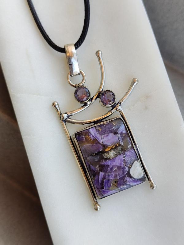 Підвісок чароїт та бронзит прямокутник. кулон з чароїту, бронзиту, аметисту. індія.