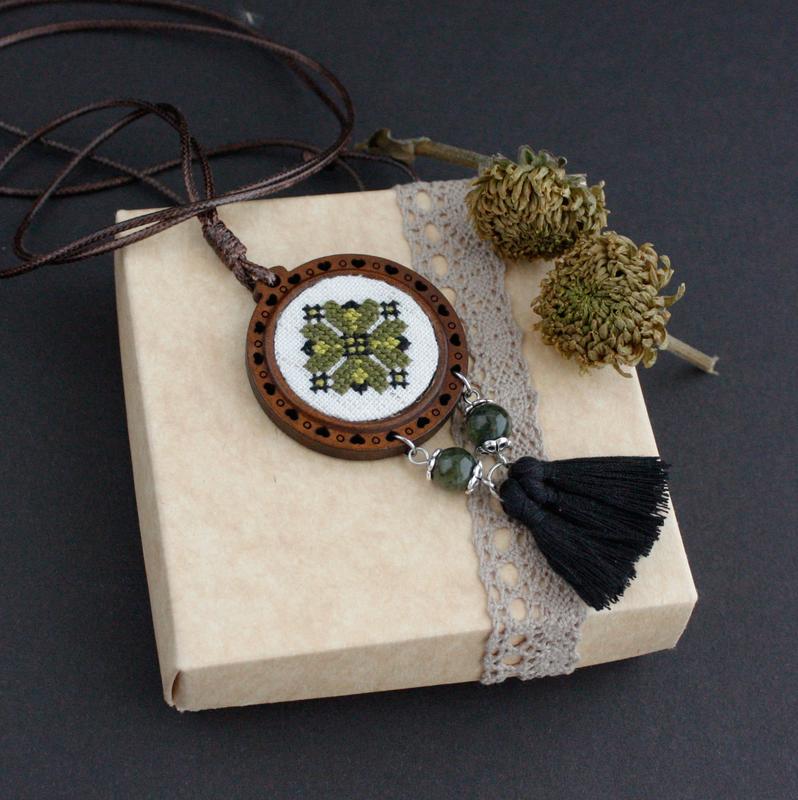 Довгий кулон у дерев′яній оправі з ручною вишивкою у стилі бохо Вироби виконуються на замовлення (термін 1-3 дні, будь ласка уточнюйте перед замовленням) Довжина шнура регулюється від 46 см до 96 см - можна урізноманітнювати під різний одяг, виріз тощо Діаметр повний 4 см, вишивка 3 см, китиці 2,5 см, намистини 8 мм Повна довжина 8 см На фото для прикладу представлено інші вироби в комплект, до ціни не включено, доступні до придбання На замовлення можливо виконання у іншій кольоровій гамі (фон, вишивка, намистини), з фурнітурою під бронзу Прикраса приїде до вас у подарунковій коробочці