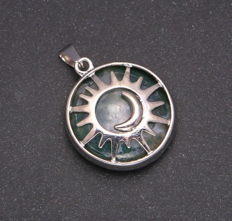 Кулон із натурального каменю моховий агат у оправі "сонце" d-27мм