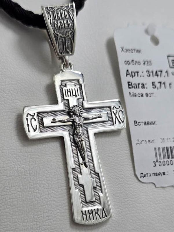 Срібний хрестик Метал: срібло 925 проби Розмір виробу: довжина 54 мм ширина 27 мм Вушко під ланцюжок 10.15 * 6.6 мм Середня вага 5.71 г Перед оформленням замовлення наявність уточнюйте, будь ласка, у *****/******** +38**************** Відправка (за наявності товару) або виготовлення тільки по передоплаті 50% або повній оплаті на картку Приватбанку/Монобанк Час виготовлення до 3 тижнів (за відсутності на складі) На всіх виробах стоїть Штамп Державної Пробірної Палати України, є відповідна проба, бирка з усією інформацією від виробника, опломбовані.