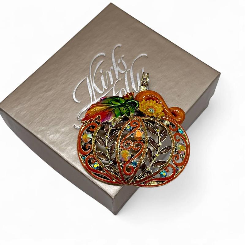 Кулон Kirks Folly с тыквой на магнитах. В комплекте оригинальная коробка. Идеальное состояние. Кулон подходит исключительно к магнитным колье. Выполнен из сплава металла золотого тона. Позолочений. Распылитель эмалью. Инкрустированный кристаллами. Размер - 7,5*7 см