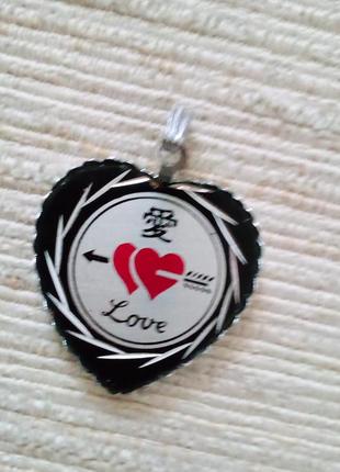 Кулон у формі серця. Фігурний край. Гравіювання на чорному тлі. Розмір 3 х 3 см. Без дефектів.