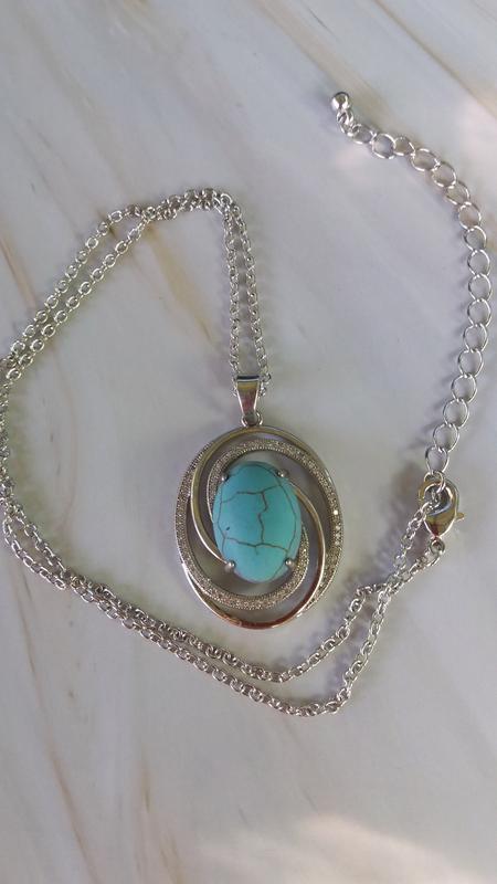 Кулон с искусственным камнем под бирюзу на цепочке серебряного цвета. Длина цепочки 40 + 7 см, кулона - 4 см.