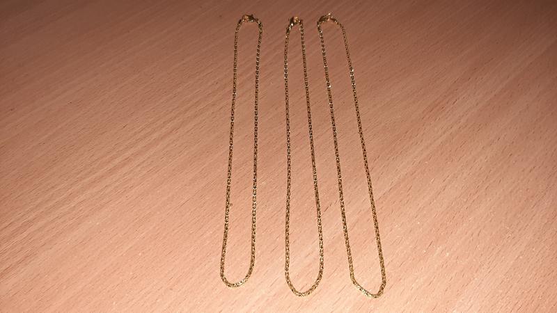 Уважно читайте умови пересилки! Пересилка товару укрпоштою на суму від 150 гривень з Оплатою на карту. Безпечною угодою пересилаю товар на суму від 300 гривень. На пересувні пункти безпечною оплатою не пересилаю, тільки повна оплата на карту. Пересилка товару новою поштою від 200 гривень, оплата тільки на карту. Перед будь якою покупкою, будь якого товару писати продавцю для уточнення Ланцюжок золотистого кольору з застібкою карабіном, довжина 43 см.Ціна вказана за один ланцюжок.