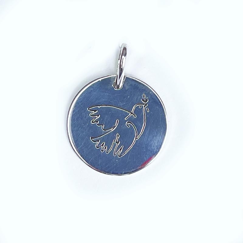 Підвіс срібний, 925 ° проба. Двосторонній. З одного боку - зображення голубу миру, з іншого - напис «Мир для України. Приблизно 2 см в діаметрі Вага - 2,40 г Вироблено в Україні, м. Харків Виріб новий, з пломбою та біркою виробника