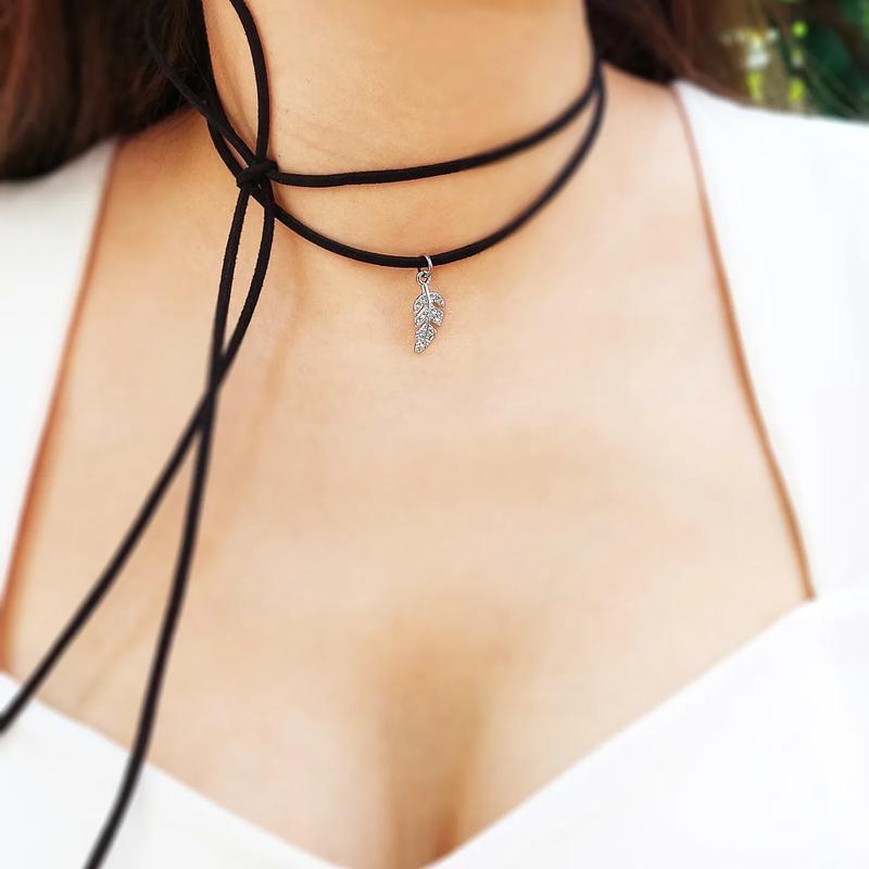 Підвіска "Пір'їнка" на замшевому шнурі. Дуже ніжна і тендітна. Чудово доповнить будь-який ваш образ! Шнур - штучна замша. Колір чорний або молочний на вибір. Колір підвіски - під срібло. Розмір 2*0.8см. Матеріал- сплав металів. Довжина шнура приблизно 135см. Кожна прикраса йде у подарунковому мішечку з органзи (колір рандомний).