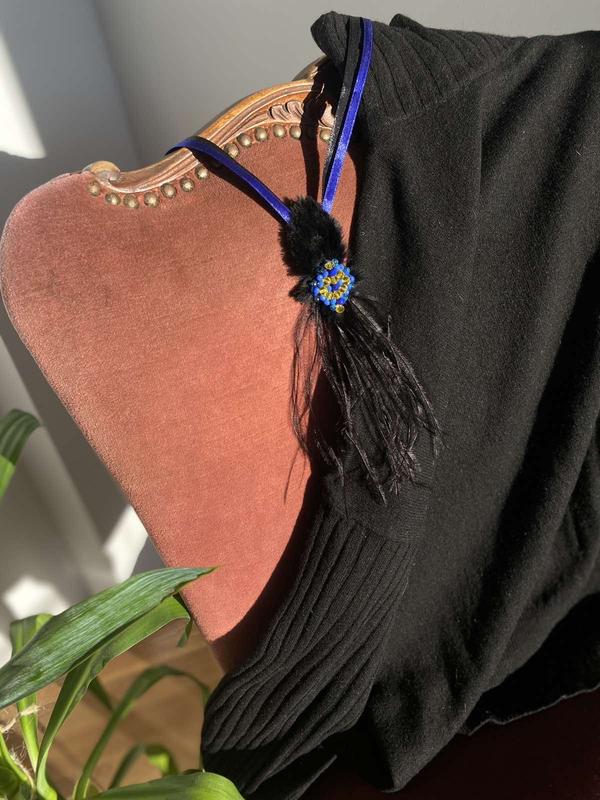 Підвіска з хутра та пірʼям оздоблена кристалами на атласній стрічці , ручна робота