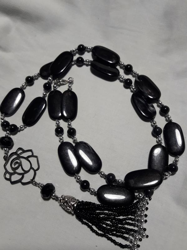 Сотуар із чорного кольору намистин та хрустальних бусін. Намисто доповнене підвіскою роза з китицею з бісера і бусін Сотуар нанизаний на ювелірний трос. застібка – карабін. Довжина намиста- 82см, а підвіски 14см. Стан вінтажний Лот можна придбати із безпечною оплатою. Перешлю по Україні НП та Укрпоштою.