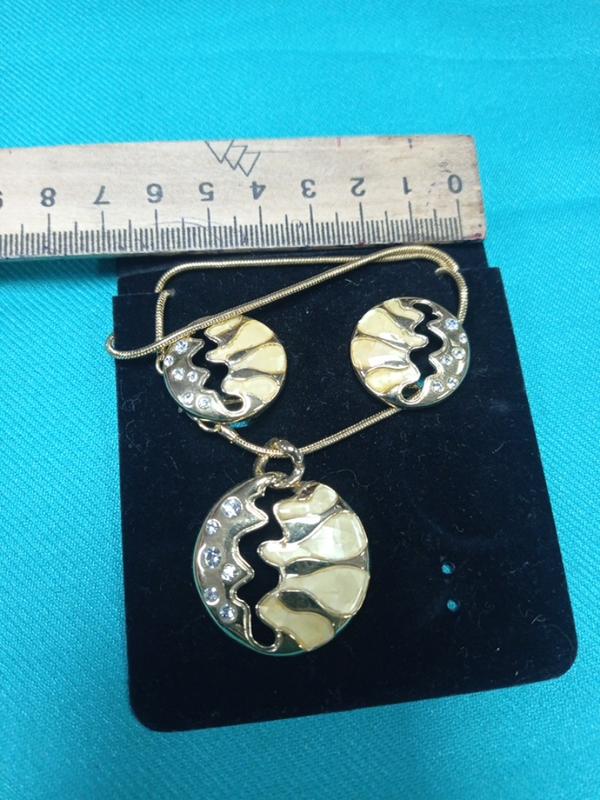 підвіски округлі..з прорізом..камінці..жовтава більш емаль..погано фото колір передає..довгий золотистий ланцюжок..метал..сережки в комплекті.