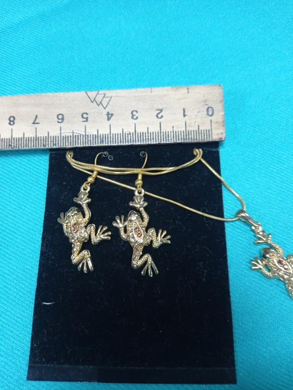 підвіска жовтий метал..з камінцями..жабки..чорні очі..коричневі камінці.. сережки в комплекті.