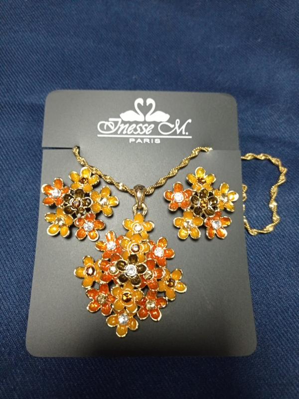 підвіска квіткова тема..емаль..камінці..довгий жовтий ланцюжок..можна регулювати..сережки в комплекті.