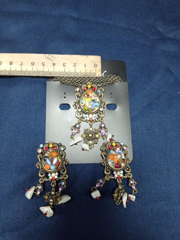 підвіска оригінальна..з великою кількістю різнокольорових камінців..кошаче око..перламутр..фіанітікі... довгий ланцюжок..під бронзу.. кліпси в комплекті.. красиво.