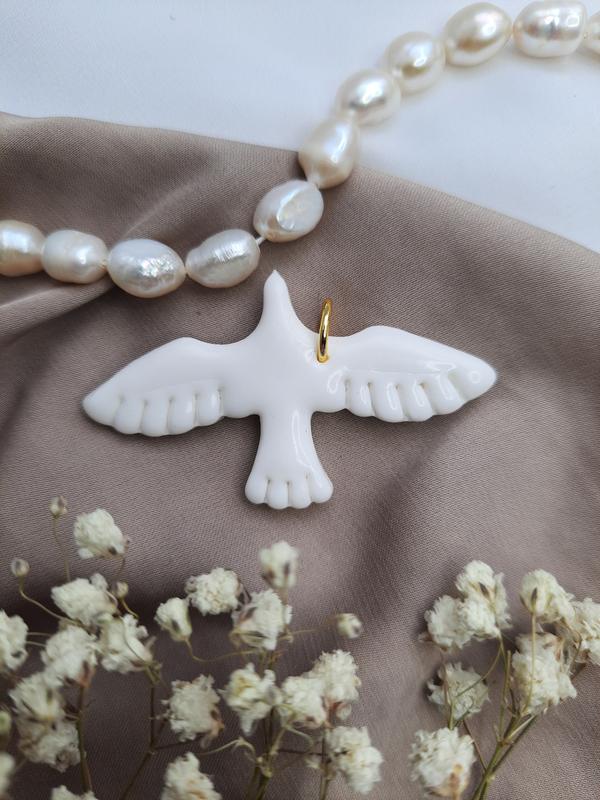 🤍Підвіска "Горлиця"🕊 _______________________ Матеріал підвіски: полімерна глина - міцна, водостійка. Замшевий шнур: 1м.20см. Розмір птаха: довжина розмах крил - 5см. Вся висота 3см. Товщина: 3мм. Кольори шнурів на вибір: білий, чорний, чорний шкіряний, червоний, бордовий. _______________________ Ціна: 200грн. 👌Примітка* Термін якості безпосередньо залежить від умов носіння та зберігання прикрас. Тому, будь ласка уникайте контакту з водою, жирними поверхнями, парфумами та лаком для волосся. Знімайте перед сном. ________________________________ 💟Подарункове фірмове пакування. ✉️Наложений платіж по предоплаті 200грн 📮Відправка Новою поштою, Укрпоштою #Соломія #Сережки #18к #золото #квадрат #чокер #прикраси #краса #перлини #кришталь #solomiya #біжутерія #круглі_сережки