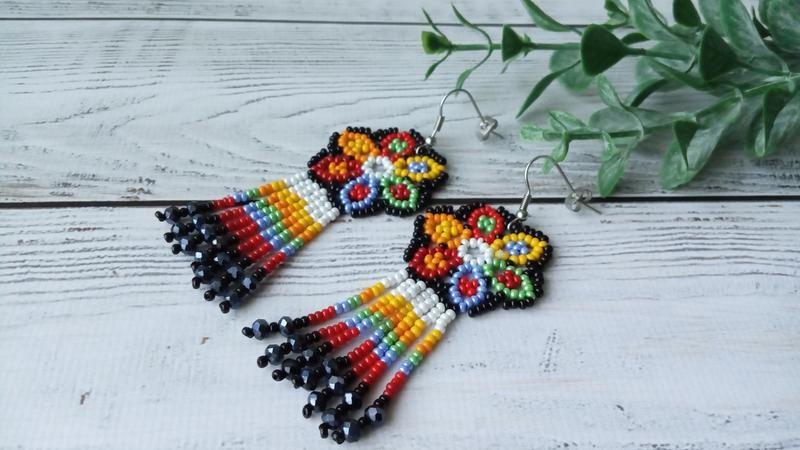 Довжина сережок-6,5см. Фурнітура,медична сталь(не темніє,не викликає алергію). Чеський бісер, кришталеві намистини, міцна нитка.