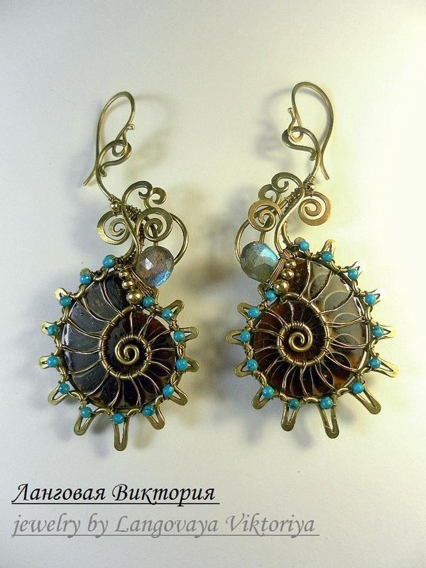 Сережки з амонітами, виконані в техніці Wire wrap, з елементами чеканки, з латунного дроту, з використанням бірюзи, лабрадориту і амоніту. Сережки штучно зістарені патиною, відполіровані і покриті захисним лаком. Розмір сережок - 7,5х3, 5см. Додаткові характеристики: Колір: Блакитний Колір: Коричневий Камені / вставки: Бірюза Матеріал: Латунь Товар виготовляється на замовлення
