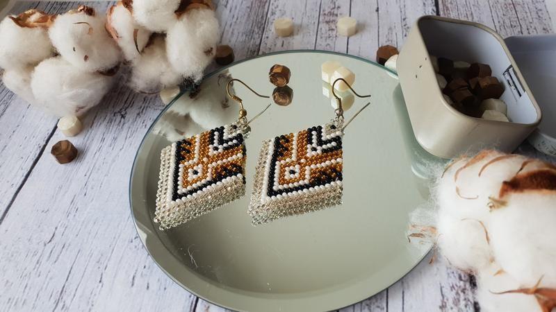 Серьги ромбы, геометрические украшения, серьги из бисера, серьги из серебристых золотым би...