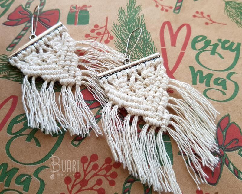 Макраме-серьги треугольной формы с бахромой выполнены из натуральных хлопковых нитей. Оригинально подчеркнут твой образ. Есть в наличии 1 пара. Дополнительные характеристики: Цвет : Бежевый Материал : Нитки Товар под заказ