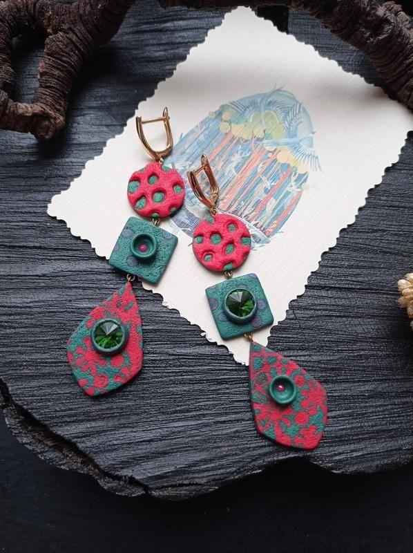 Стильні сережки,легкі з полімерної глини і гіпоалергенною сталі. Додаткові характеристики: Колір: Зелений Колір: Червоний Матеріал: Полімерна глина Матеріал: Скло