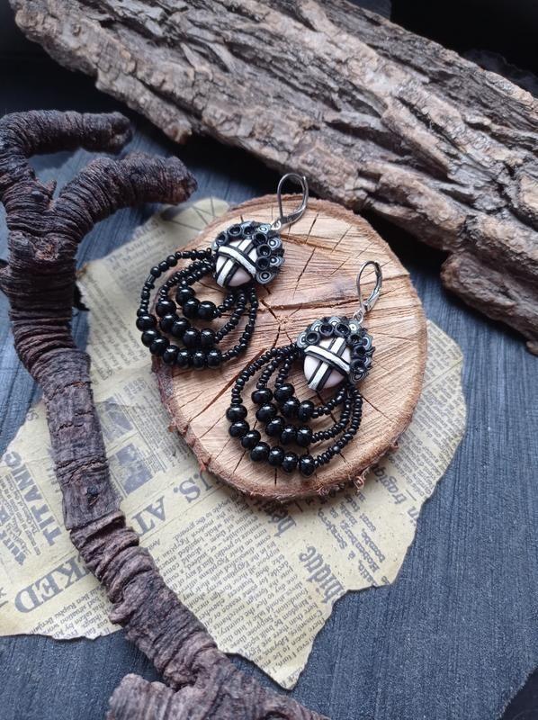Сережки ручної роботи з бісером Додаткові характеристики: Колір: Білий Колір: Червоний Матеріал: Бісер Матеріал: Намистини Матеріал: Медична сталь Матеріал: Полімерна глина