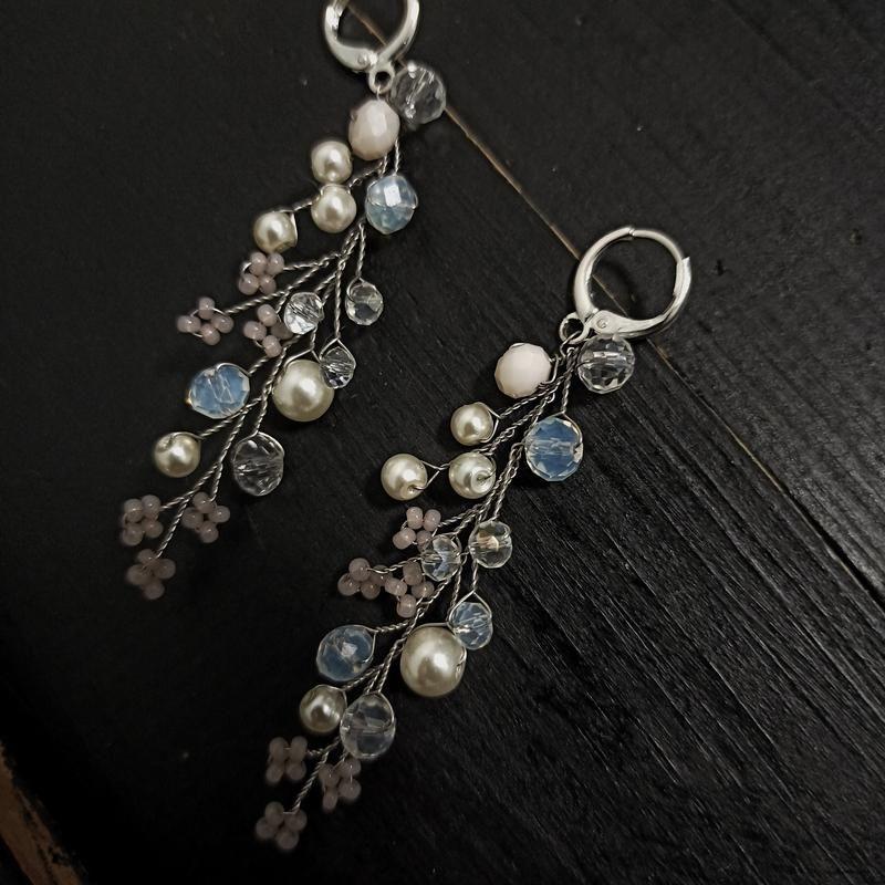 Створено з ювелірної дроту, кришталевих намистин, чеського бісеру. Для повного комплекту можу доповнити прикрасою волосся, браслетом, кольє, бутоньєркою. Так само виконати в іншому кольорі під ваш образ. Догляд: бажано прикраса зберігати в окремій коробочці, в дали від вологи та води. Відправка: нова пошта, Укр.-поштою, Justin. Оплата: на картку приватбанку, за безпечною угоді або післяплатою (передоплата 80 грн. – доставка в обидві сторони) Пишіть, в наявності дуже багато прикрас, зможу підібрати максимально ідеальне для вас.