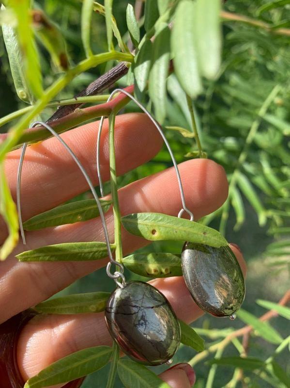Стильні срібні сережки з натуральним піритом. Срібло 925 проби високої якості, без домішок. Довжина сережок 6 см. У моєму магазині багато прикрас з піритом, можна підібрати комплект. Пірит відсвічує сильним металевим блиском і має жовте забарвлення з латунним або золотистим відливом, що навіть нагадує золото. Спостерігається як зовнішнє подібність, а й подібність по лікувальним властивостям піриту і золота. Вважається, що цей мінерал здатний благотворно впливати на нервову систему людини. Народні цілителі вважають, що пірит потрібно носити людям, які страждають від нервових виснажень. Камінь здатний також покращити настрій, підняти працездатність та загальний життєвий тонус. Пірит допоможе позбутися зайвих страхів, дасть людині впевненість у собі та можливість стати лідером. Однак камінь має таку магічну силу, що найвищі людські якості можуть легко перетворитися на самозакоханість і гордість. Тому фахівці не рекомендують носити його більш ніж три дні поспіль, і взагалі не варто носити його людям, які схильні до запальності, агресії та зайвої збудливості. Відправка товару після повної оплати або післяплатою після передоплати 100 грн Додаткові характеристики: Колір: Зелений Камені / вставки: Пірит Матеріал: Срібло