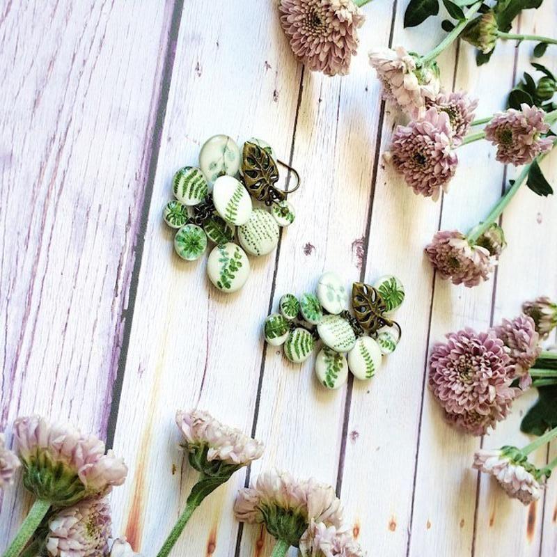 Серьги с фирменными двухсторонними подвесками из ювелирной смолы с рисунком стилизованных кактусов, суккулентов, листьев папоротника и монстеры. Дополнены металлическими элементами в виде листика тропического растения монстера. Фурнитура - бижутерный сплав, цвет - бронза. Легкие и удобные в носке. Дополнительные характеристики: Материал : Эпоксидная смола