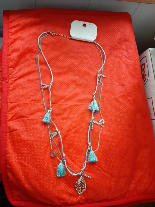 комбінована прикраса з текстильною ниткою та камнем.Довжина всієї 90см