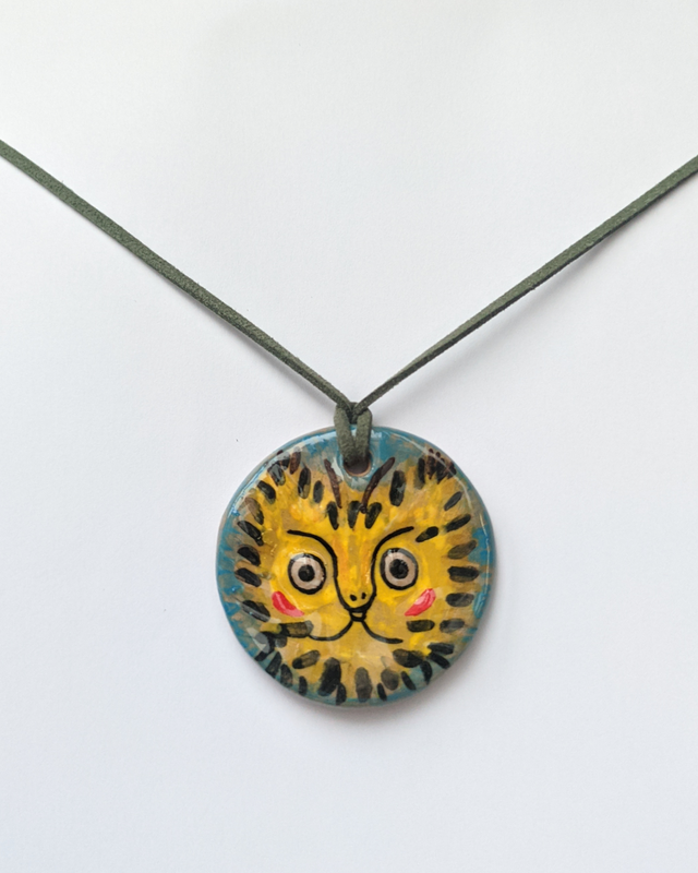 Керамічна прикраса "Кіт Поліни Райко" 🎨Матеріали: глина МКФ2, ручний розпис ангобами, полива, 2 випали 📐Розмір: 5 см, товщина 4 мм, шнурівка 80 см (вид шнурівки на ваш вибір) 💰Ціна: 400 грн 📦Спосіб доставки: НП 1-2 дні 📖Історія: авторка малюнку - Райко Пелагея (Поліна), цей неймовірний кіт жив на стіні її будинку у Олешках