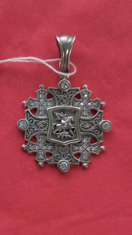 Срібний Єрусалимський хрест 925 проби , великий з чорнінням хрест, в оточенні маленьких чотирьох хрестів, посередині зображення Георгія Змієборця, вага виробу 7,68 грам. Виробник Бігсан м. Біла Церква.