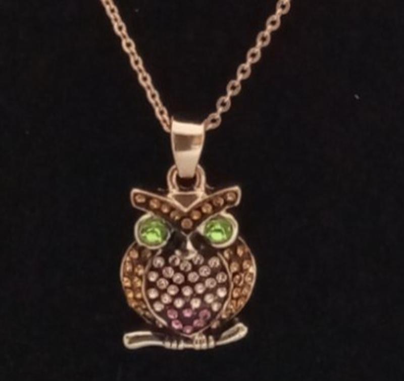 Яскравий підвіс Сова на ланцюжку. Підвіс і ланцюжок зроблений із ювелірного сплаву золотого кольору. Підвіс оздоблений різнокольоровими кристалами. Довжина ланцюжка 45 см , також є подовжуючий ланцюжок довжиною 5,5 см.. Прикраса сучасна , стильна, підійде під різний одяг.