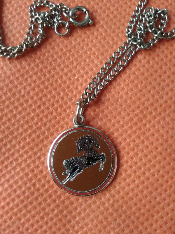 Підвіска «Чорна собака» з ланцюжком, посрібнена. Нульові, США. На зворотній стороні є клеймо виробника. Техніка: перегородчата емаль. Діаметр підвіски 1,9см, довжина ланцюжка 62см.