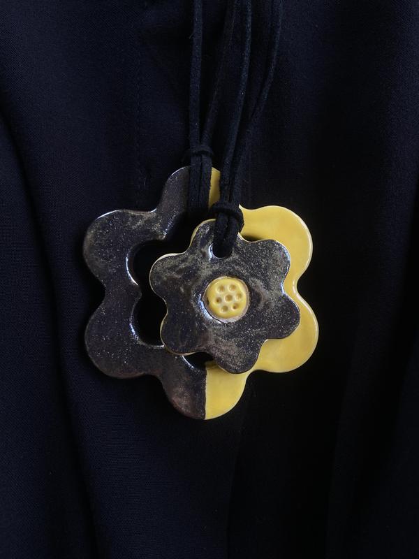 Пара керамічних підвісок ручної роботи. Біла глина, глазурі жовта і сірий металік. Йдуть в наборі із замшевими шнурками жовтого або чорного кольору на вибір. Гарне подарункове пакування. Можна носити парою на шиї і сумочці або на двох з коханою людиною - комбінувати за смаком і настроєм.