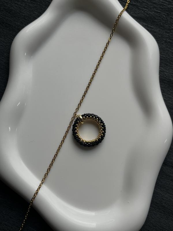 Підвіска з чорного японського бісеру з золотистою серединкою Діаметр кільця 2,5 см Довжина 56 см з можливістю регулювання Фурнітура гіпоалергенна, не темніє Можливий повтор у іншому кольорі або сріблі