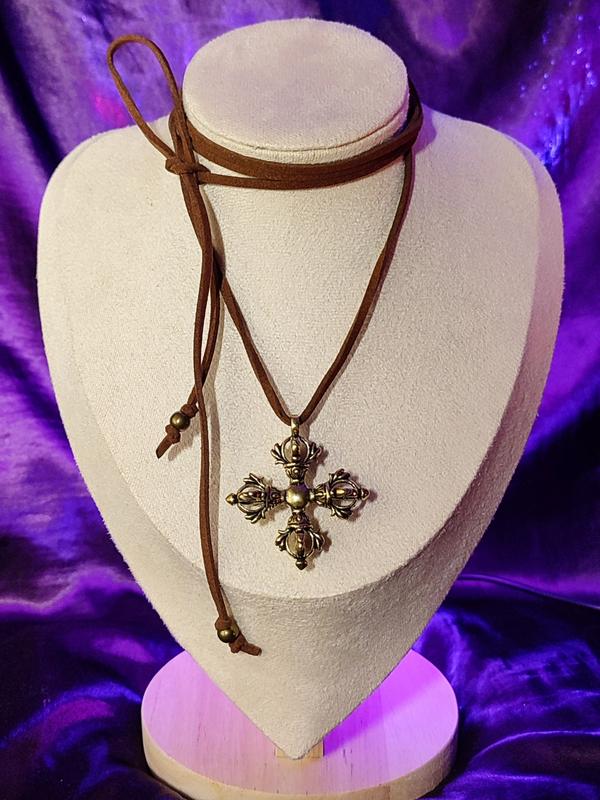 Чокер «Хрест Ваджра» ручной работы на коричневом шнурке Стильное украшение ручной работы с массивным кулоном «крест Ваджра» – символом силы, устойчивости и защиты. Шнур цвета кофе выполнен из эко-кожи, мягкий, приятный на ощупь и легко регулируется по длине. Характеристики: Длина шнура: 140 см Материалы: кожа, кулон из цинкового сплава Цвет шнура: кофе / коричневый Цвет кулона: золотистый темный Застежка: завязки Ручная работа Выразительное и символичное украшение, которое подчеркнет индивидуальность. Подходит для повседневного стиля, тематических образов и как уникальный подарок. Каждый чокер создан вручную, поэтому имеет свой особый характер.
