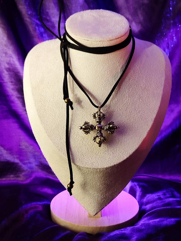 Чокер на шию хрест ваджра ручної роботи на шнурку шкіра прикраса на шию 140 см чорний куло...