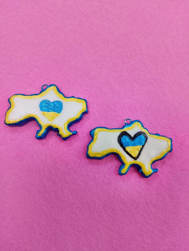 Мапа України з полімерної глини, ручний розпис. Можна використовувати як підвіску для брелока, або як кулон. Розмір 4х3,7 см