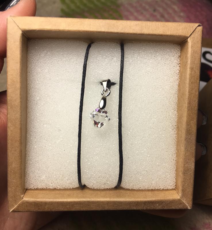 Дуже крута підвіска на шию, дуже переливається та виблискує. Фурнітура - вощений шнур та посріблена металева фурнітура.