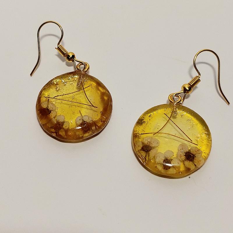 Сережки ручної роботи з ювелірної смоли та живих квітів, 20 мм, вушка позолочені. Коляр янтарю .