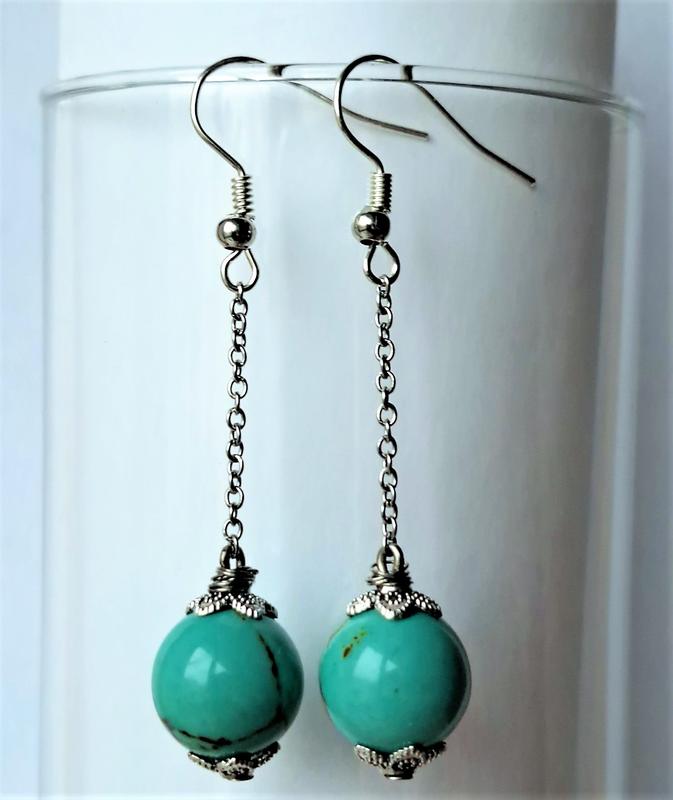 Сережки з натуральної пресованої бірюзи, намистина 12 мм, довжина зі швензою ОК 7 см є намистини від 6 до 12 мм бірюзи білої й бірюзової, ланцюжок зробить потрібної вам довжини
