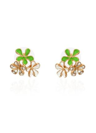 Сережки 962911 Сережки, стилізовані під скарби з оригінальним зовнішнім виготовленням і високим рівнем якості, мають особливий попит у сучасних модниць. З їх допомогою можна урізноманітнити будь-який образ. Біжутерія дуже схожа з виробами з дорогоцінних металів, але коштує водночас в кілька разів дешевшою. Невелика ціна дає змогу придбати відразу кілька комплектів для повсякденних або святкових аутфітів. В асортименті представлені прикраси в декількох колірних варіантах — кожна дама підбере для себе найвідповіднішу. Прикраси виготовлені у формі букета з трьома п'ятипелюстковими квіточками. Поверхня двох декоративних елементів пофарбована емаллю, а один доповнений красиво блискучими на сонці стразами. Аксесуар має витончений вигляд, чудово підходить усім дамам, вирізняється невеликою вагою й не викликає дискомфорту навіть після тривалого носіння. Сережки утримуються за допомогою затискачів-цвяшок, які вирізняються надійністю й мінімізують шанс втрати сережок. Завдяки цьому кріпленню виріб можна повертати в потрібному положенні. Основу в золотистому відтінку краще поєднувати із зеленими речами, а сріблясті вироби мають гарний вигляд із насиченішими тонами.